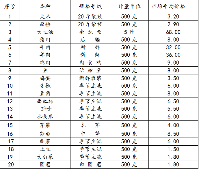 梨树县副食品价格表