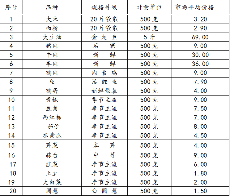 梨树县副食品价格表