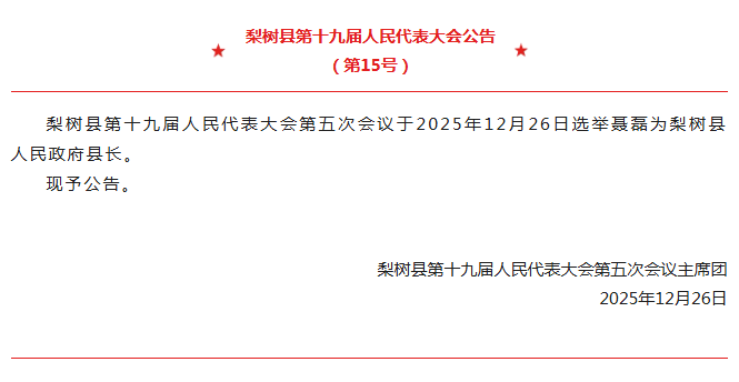 会议表决通过了总监票人、副总监票人、监票人名单,公布了各项候选人名单。会议以无记名投票方式,选举聂磊为梨树县人民政府县长,徐滢为梨树县人民法院院长,刘再军为梨树县第十九届人民代表大会常务委员会委员。