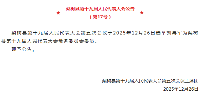 姜青山在讲话中指出,梨树县第十九届人民代表大会第五次会议,在全体代表和与会同志的共同努力下,圆满完成了各项议程。会议期间,各位代表不负组织重托、不负人民期待、不负时代使命,议全局之事、建肺腑之言、献务实之策,充分体现了心系梨树、情系百姓的深厚情怀,充分展现了奋发有为、昂扬向上的政治热情和精神风貌。会议选举了县人民政府县长、县人民法院院长和县人大常委会委员。审议通过的各项报告决议、“十五五”规划决议和提出的意见建议,凝聚了全体代表的智慧,起到了提振信心、凝聚共识、引领方向的重要作用,充分体现了党的主张和人民意愿的高度统一。这是一次凝心聚力、共谋良策、团结奋进的大会,必将激励全县上下朝着打好打赢高质量发展“六场战役”的目标阔步前行。